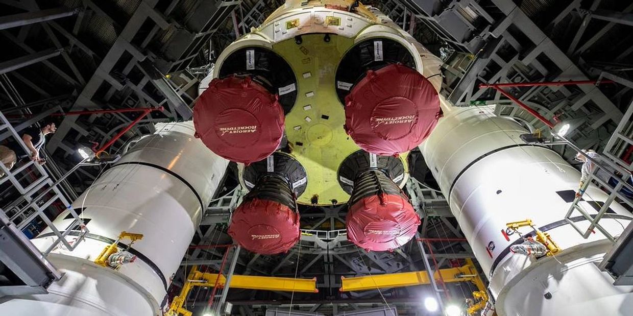 The core stage of the Space Launch System (SLS) rocket for NASA’s Artemis I mission was placed on the mobile launcher in between the twin solid rocket boosters inside the Vehicle Assembly Building (VAB) at NASA’s Kennedy Space Center. The boosters attach at the engine and intertank sections of the core stage. Serving as the backbone of the rocket, the core stage supports the weight of the payload, upper stage, and crew vehicle, as well as carrying the thrust of its four engines and two five-segment solid rocket boosters. After the core stage arrived on April 27, engineers with Exploration Ground Systems and contractor Jacobs brought the core stage into the VAB for processing work and then lifted it into place with one of the five overhead cranes in the facility.